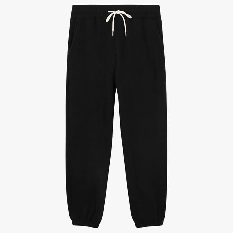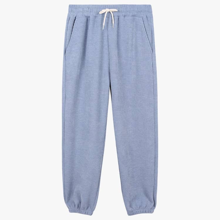 بنطلون مريح وواسع (سويت بانتس) بخامة مضلعة ناعمة. يتميز برباط خصر أبيض وأساور مطاطية عند الكاحل. مثالي للرياضة، أو ملابس المنزل المريحة.